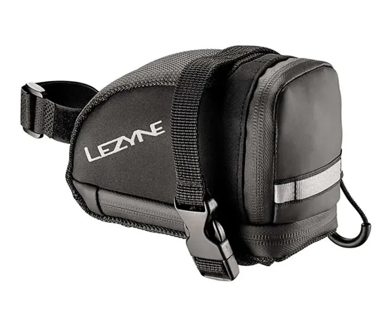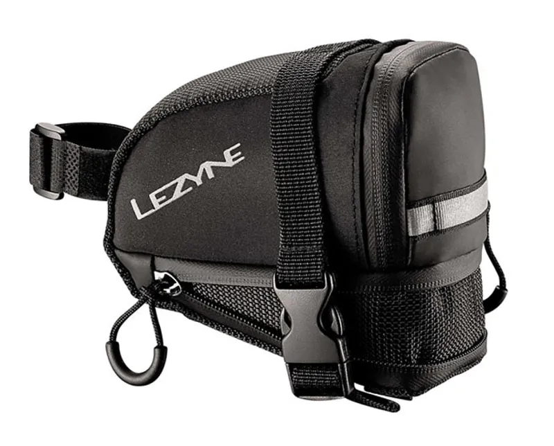 Expandable wedge-shaped saddle bag. A buckle system attaches the Lezyne EX Caddy to the saddle rails and seat post. Durable woven nylon construction. Labelled internal organizational pockets. The Lezyne EX caddy’s reflective logos and loop increase night visibility. Water-resistant zipper with large pull loop.