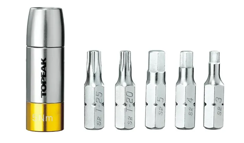This preset torque socket (4Nm/5Nm/6Nm) kit will work with any mini tool containing a 5mm Allen wrench (or single 5mm Allen wrench) to apply correct torque values on component bolts for safety and to prevent damage to expensive carbon parts. A carry case neatly stores one preset 4 Nm (5Nm or 6Nm) and the 5 most popular tool bits (3/4/5mm hex & T20/T25 Torx).