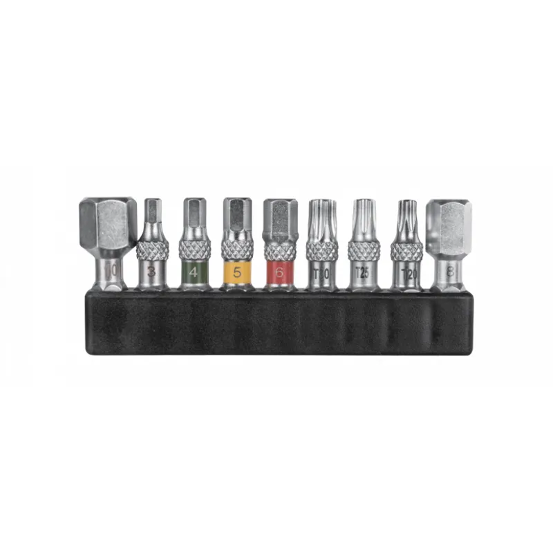 Torque wrench with an adjustable preset range of 4-20Nm features a standard hex drives reversible ratcheting head. Includes 9 tool bits with a generous 30mm length for reaching tough bolt locations. Knurling on the individual tool bits provides additional grip when changing or removing from the organizer.